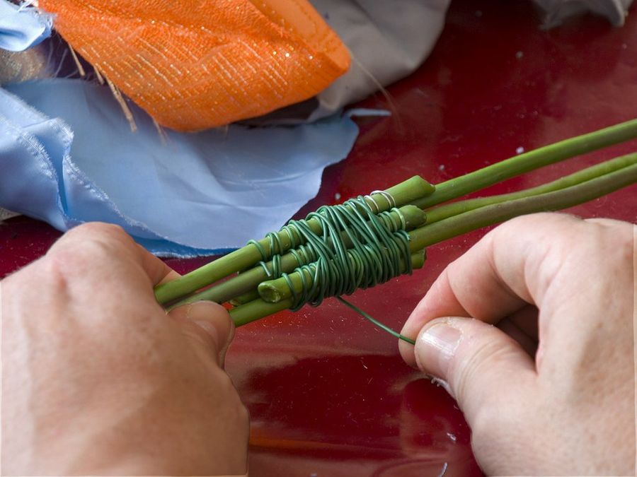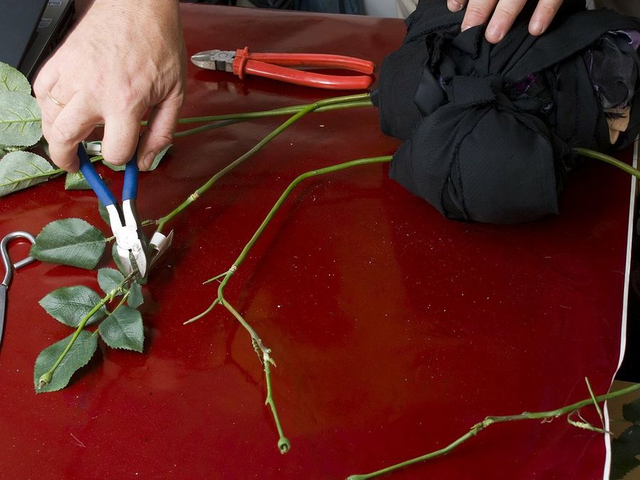 Ahora cortamos las hojas y las ramitas secundarias de los tallos, dejando sólo el tallo principal, que será el que doblemos para fingir las articulaciones. Las hojas y ramitas llevan también un alambre en el interior, por lo que utilizaremos una herramienta de corte adecuada.