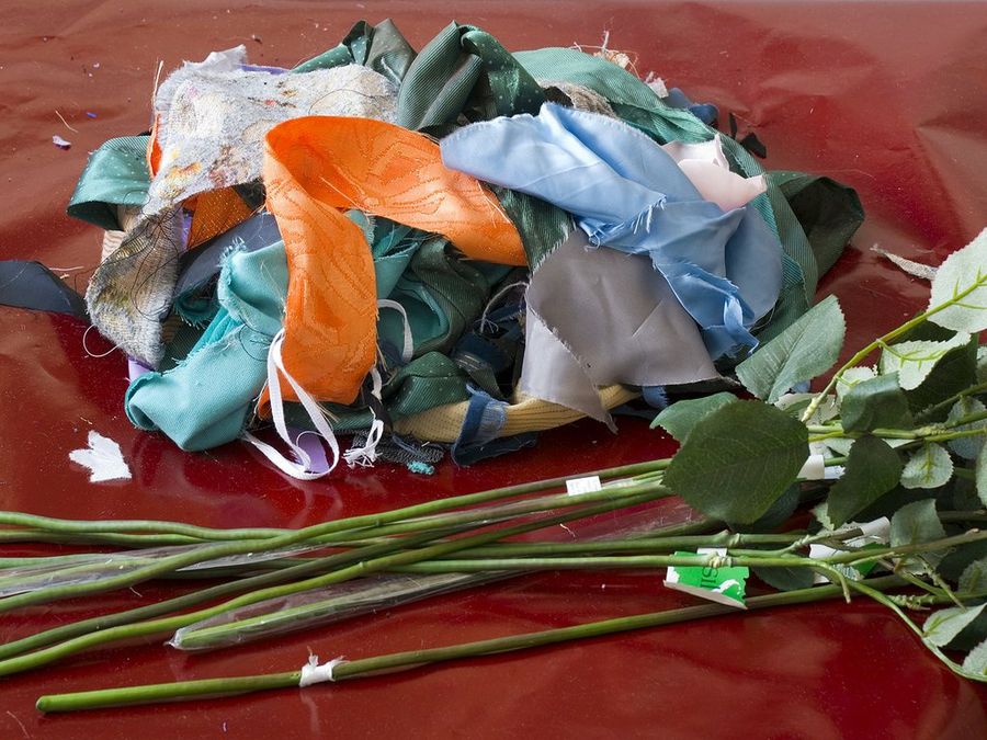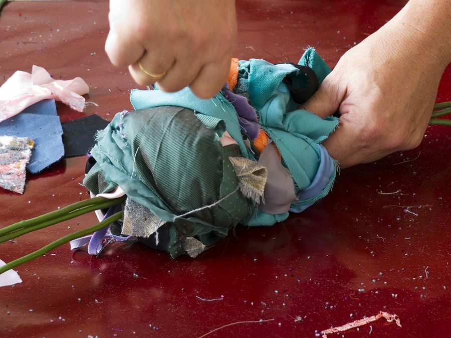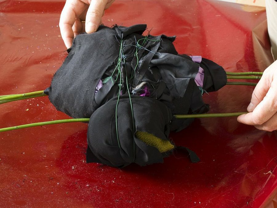Los últimos trozos no los sujetamos con alambre, sino con nudos en el tejido. Para ello, sacamos tiras si hace falta de los retales más alargados. También podemos emplear cintas negras.