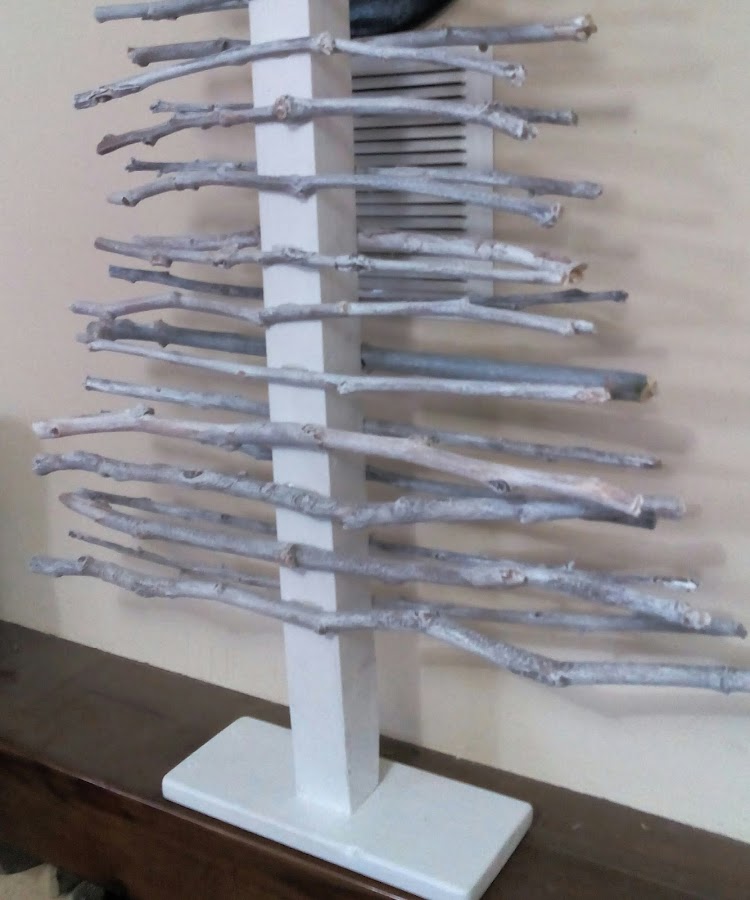 Las ramas las pinte con pintura acrílica blanca, pero lo hice con pincel seco, quería que también se viese el color natural. Una vez secas las fui pegando en el listón con silicona caliente.