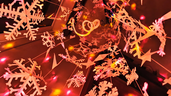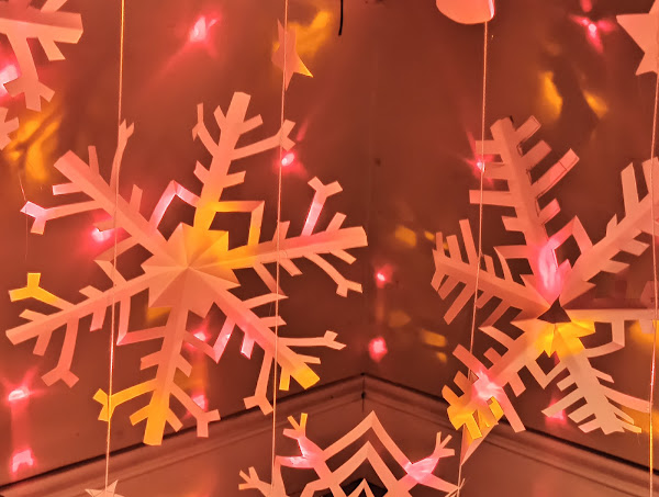 Los efectos de las luces sobre el papel... en el techo...El toque de las luces blancas de la base... El reflejo en el suelo y en las paredes... Está chulísimo y te quedas mirándolo como hipnotizado orgullos@ del trabajo realizado. Así estoy yo. Encantada.