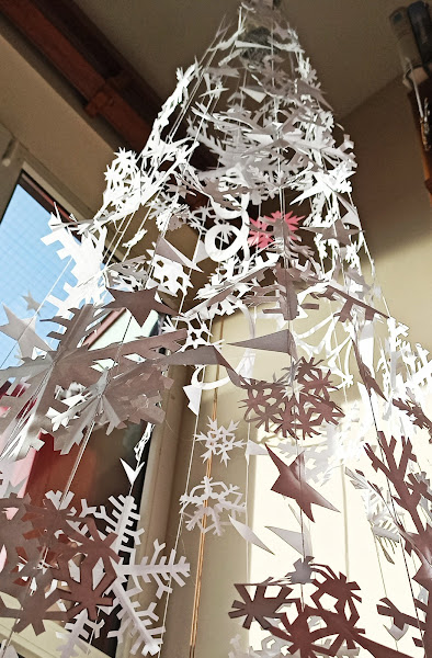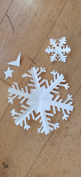 Ahora tocaba el trabajo en grupo. así que con la ayuda de mis hij@s nos pusimos a hacer copos de nieve, estrellas y decoraciones de papel de todos los tamaños.