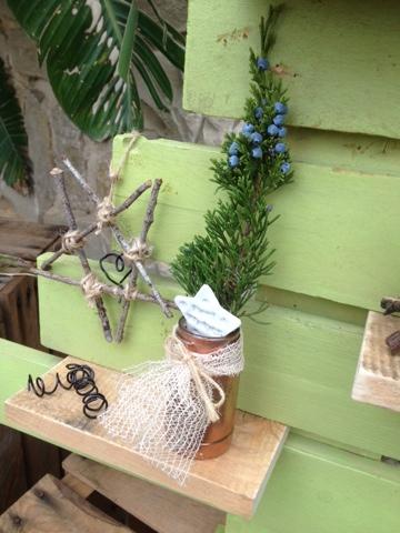 estrella de pasta das,una ramita de ciprés y envuelto con un lacito...