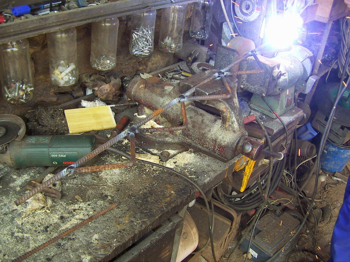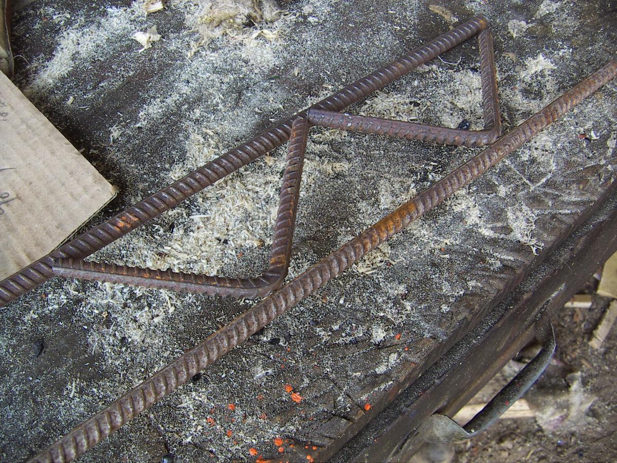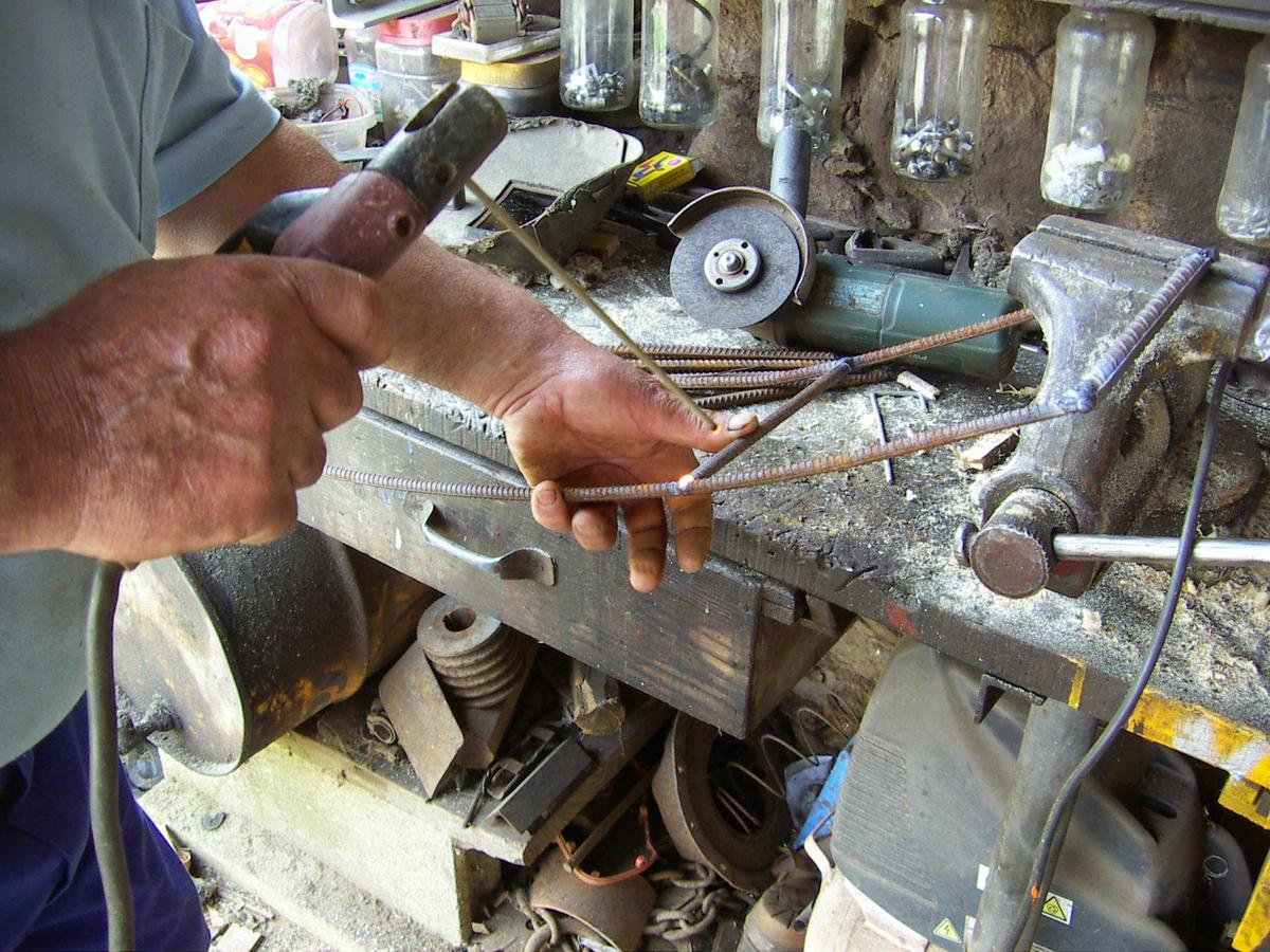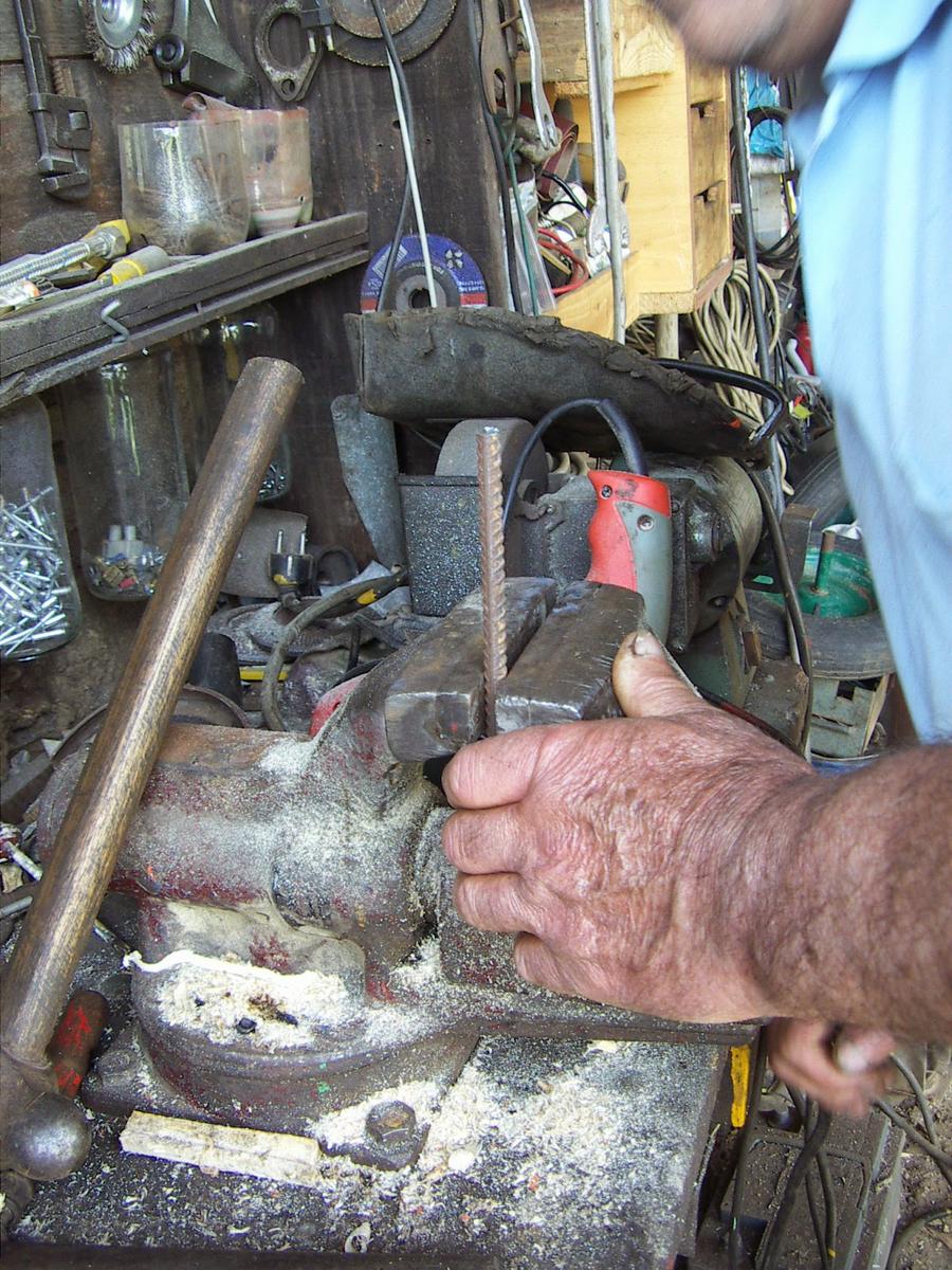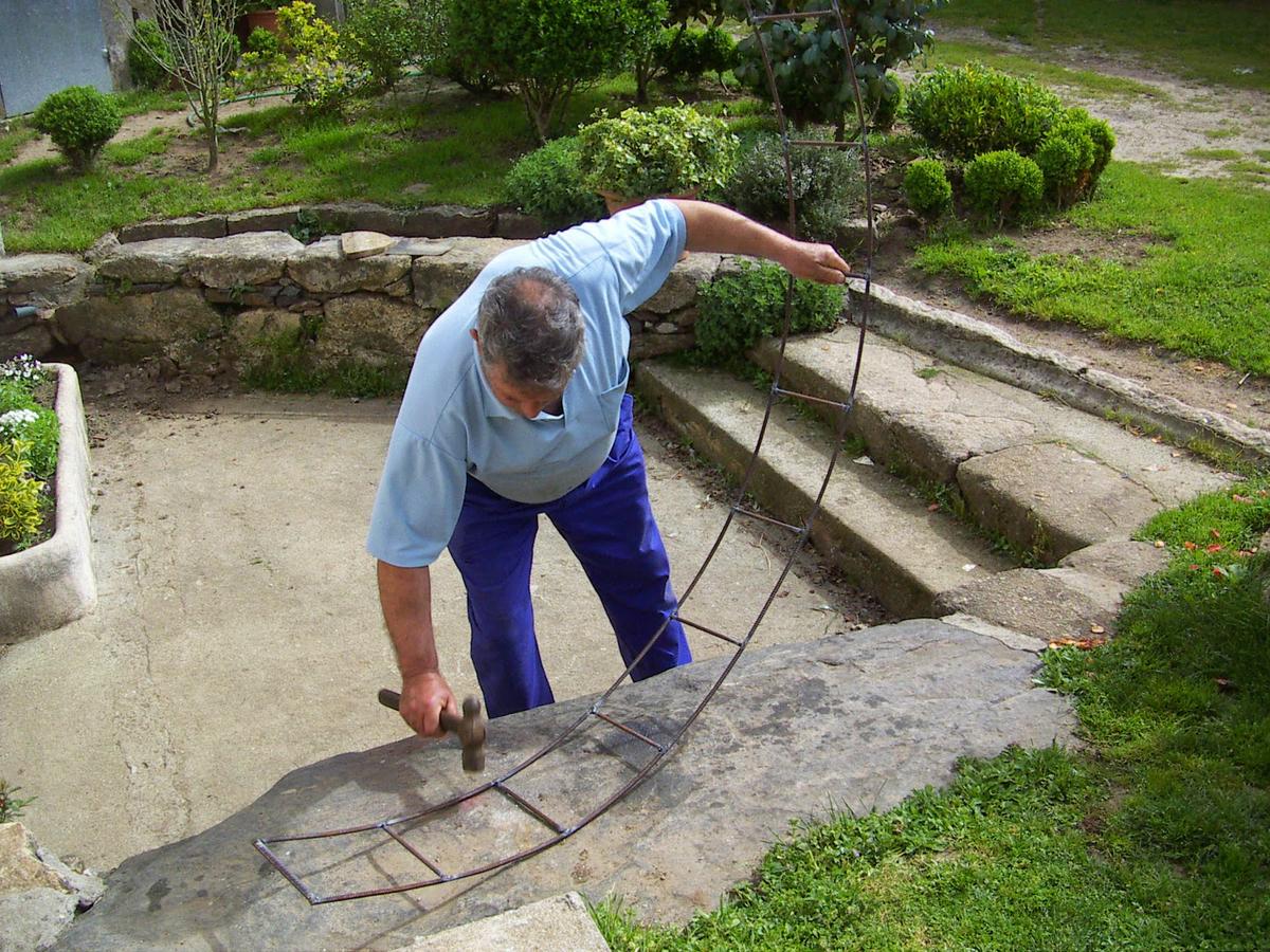Cortamos dos varillas iguales para hacer el arco y aquí vemos a Paco dándoles forma a base de martillazos...
