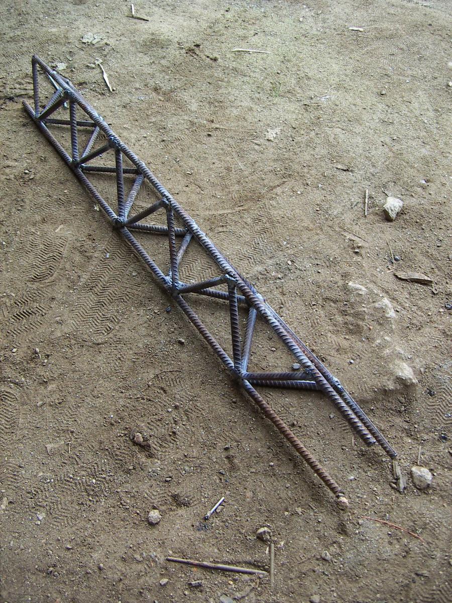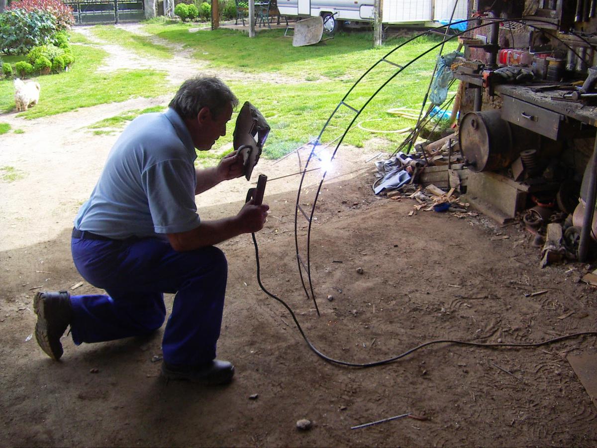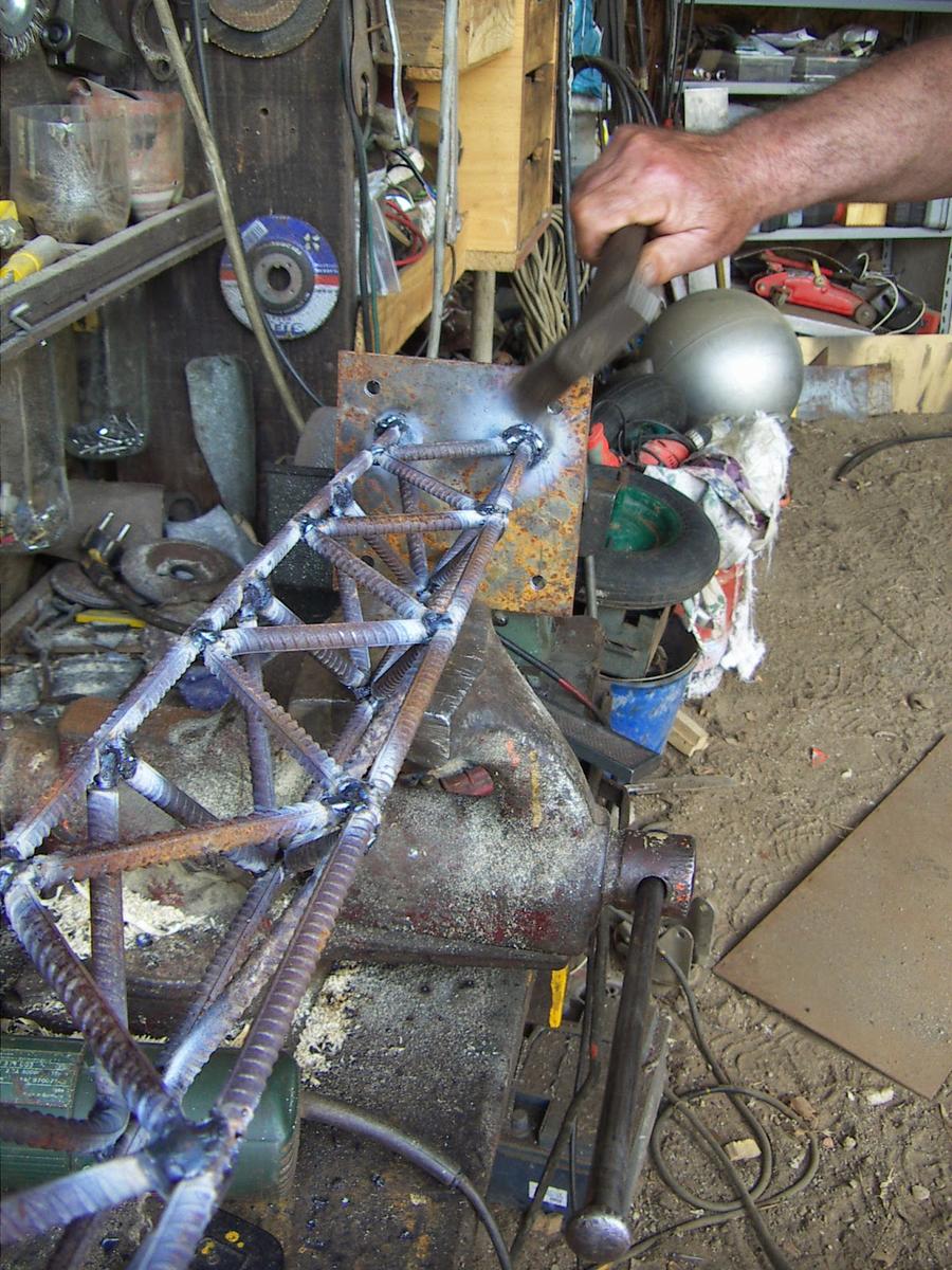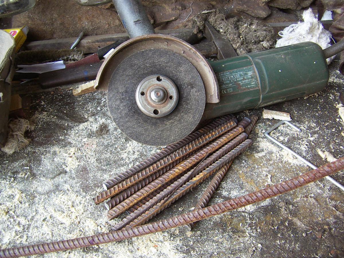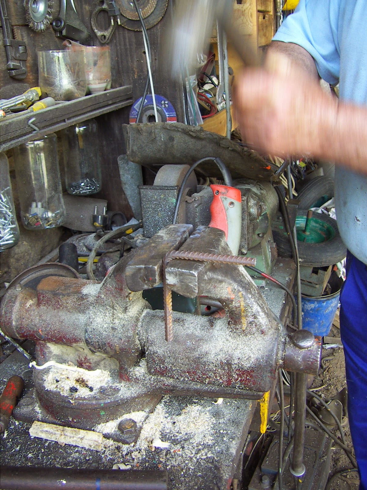 Cortamos dos varillas iguales para hacer el arco y aquí vemos a Paco dándoles forma a base de martillazos...
