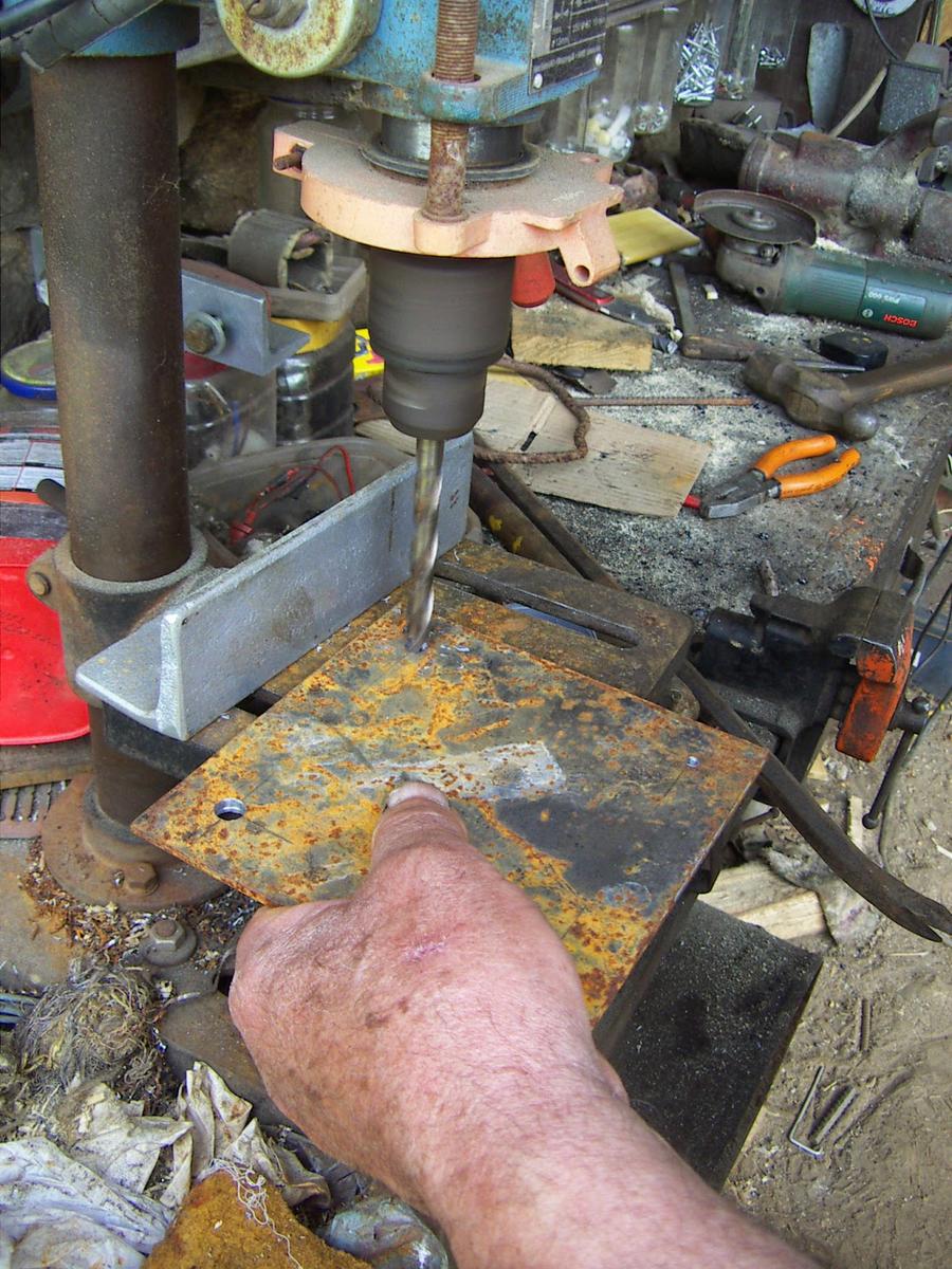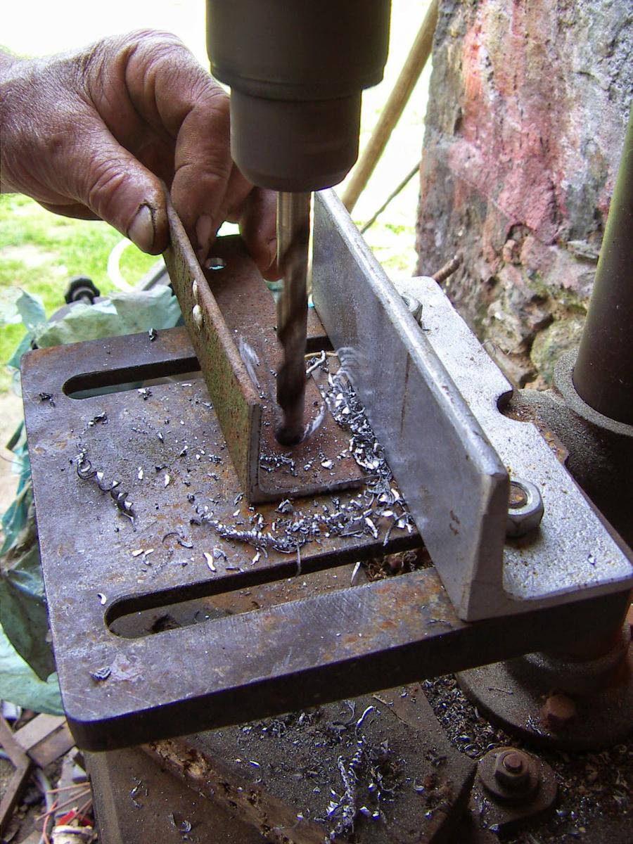 Cortamos una base de hierro para soldarla a la base y le haremos unos agujeros con el taladro para poder pasar por ahí los tornillos.