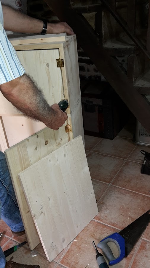 Tomamos las medidas de las puertas y las vamos colocando con sus bisagras, yo puse bisagras vistas de librillo, son mas fáciles de colocar