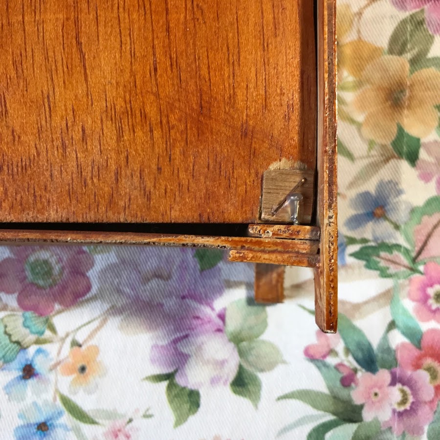 Aquí veis que ya he pegado un palito de madera con silicona para hacer la barra donde irían colgadas las perchas con la ropa. El sistema original terminó despegándose y perdiéndose así que había que inventarse algo para hacerlo funcionar. Arreglé también los sistemas de apertura de las puertas con nuevos alfileres y pistola de silicona.