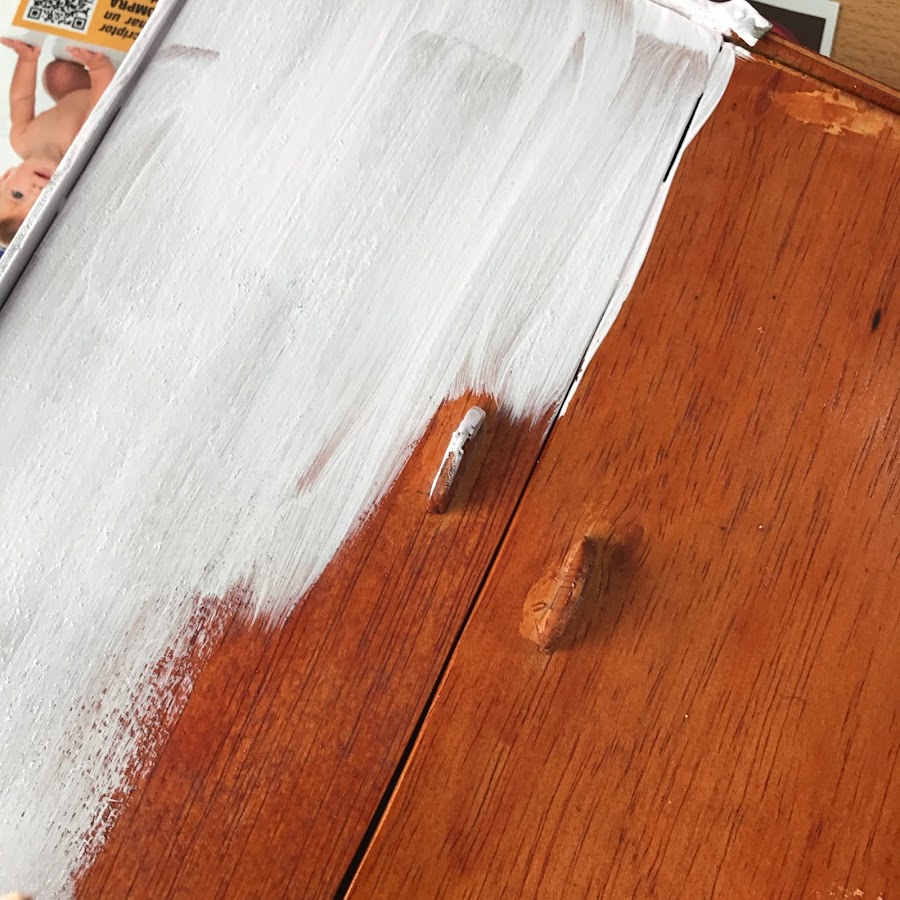 El barniz estaba muy cuarteado con el paso de los años e incluso raspado en muchas partes así que lo primero de todo fue elegir una pintura, aunque en las fotos se vea muy blanco es un rosa muy clarito, Chalk Paint como siempre, de las últimas que han salido a la venta en Lidl.