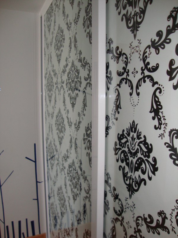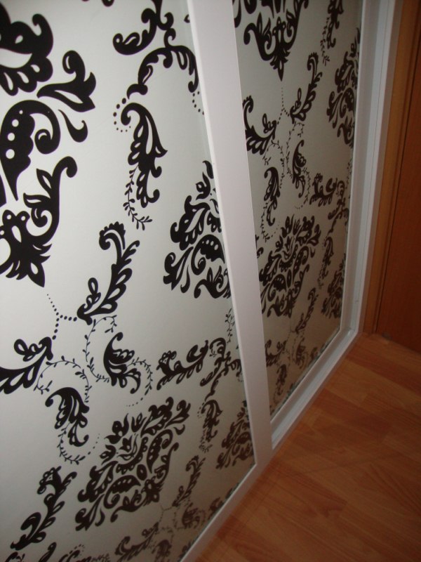 Para terminar, coloqué entre cristal y parte trasera de la hoja ( una melamina), un papel decorativo de pared. De esta forma podré cambiarlo tantas veces como desee, obteniendo así un armario totalmente distinto.