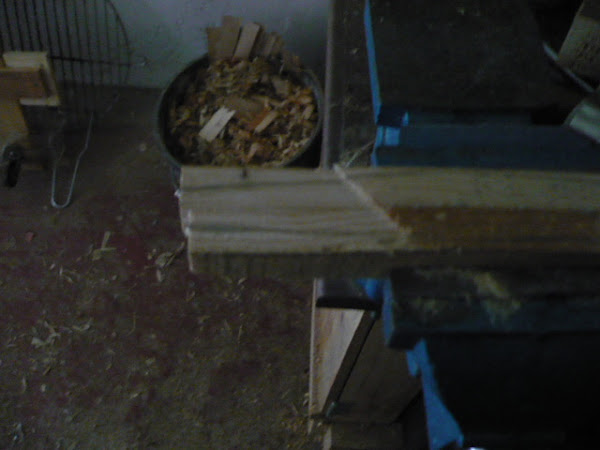 Buscando entre la madera que tengo almacenada, no encuentro un trozo con las dimensiones adecuadas, así que tengo que encolar dos listoncillos que corto de una tabla de palet.