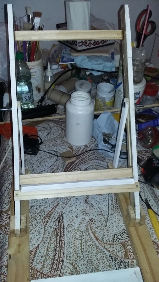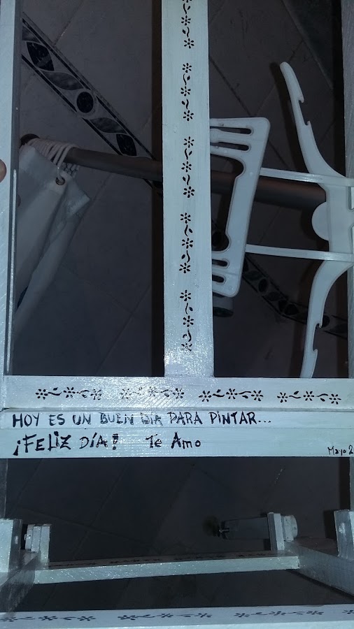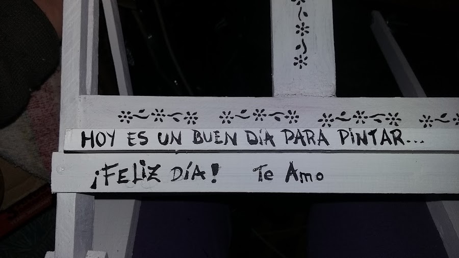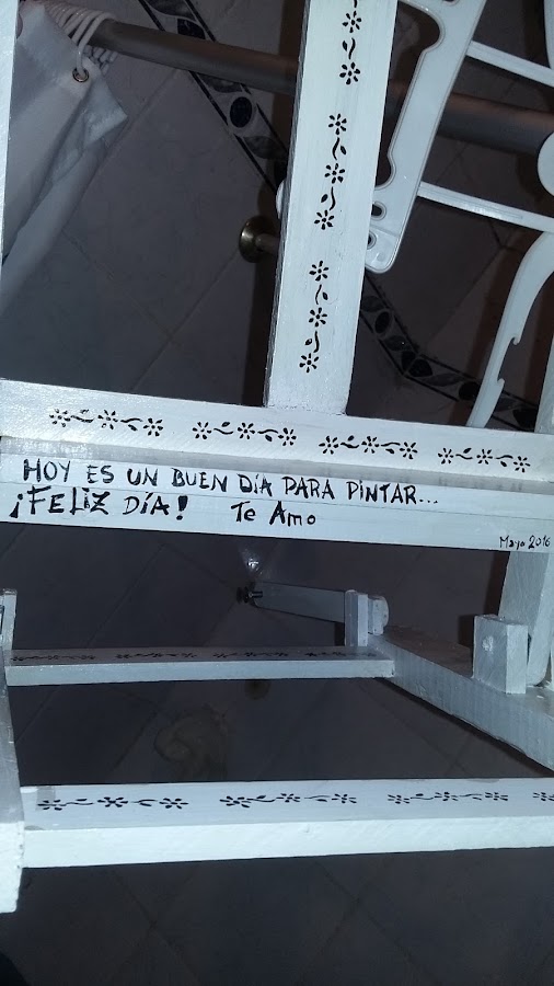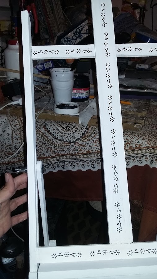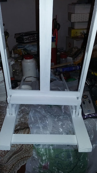 De a poco tomó forma el atril. Luego debía pintarlo, en principio quería hacerlo muy colorido, alegre...pero luego de sentarme a tomar un café para descansar y reflexionar, me di cuenta que el color debe darlo el cuadro que esté pintando mamá en este atril, así que opté por pintar con látex blanco, y decorar con unas florecitas pintadas en acrílico negro y una frase que la inspire.