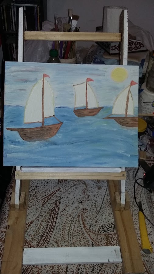 Así se ve con un cuadro que está empezando a pintar la feliz dueña de este atril hecho con material reciclado. Aún estaba a medio terminar el atril también, jajaja. El cuadro creo que aún no lo ha terminado, o por lo menos no me lo ha mostrado, jajaja.