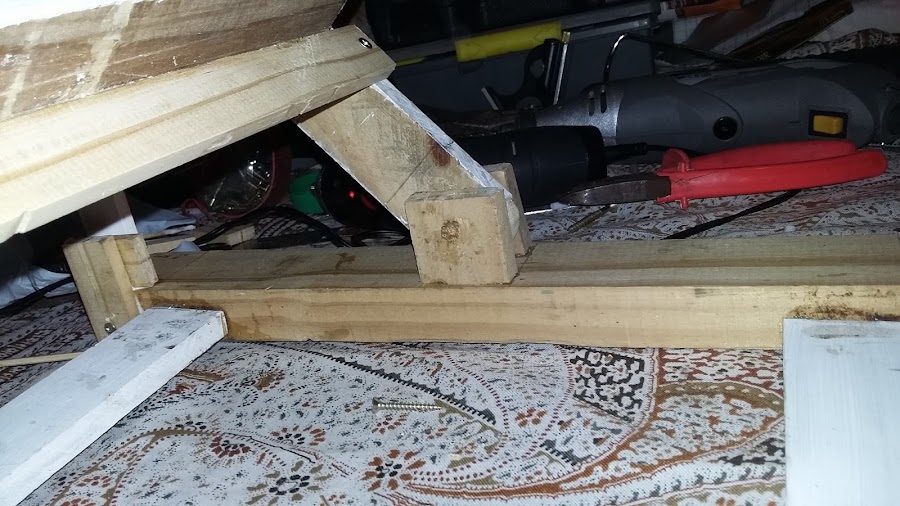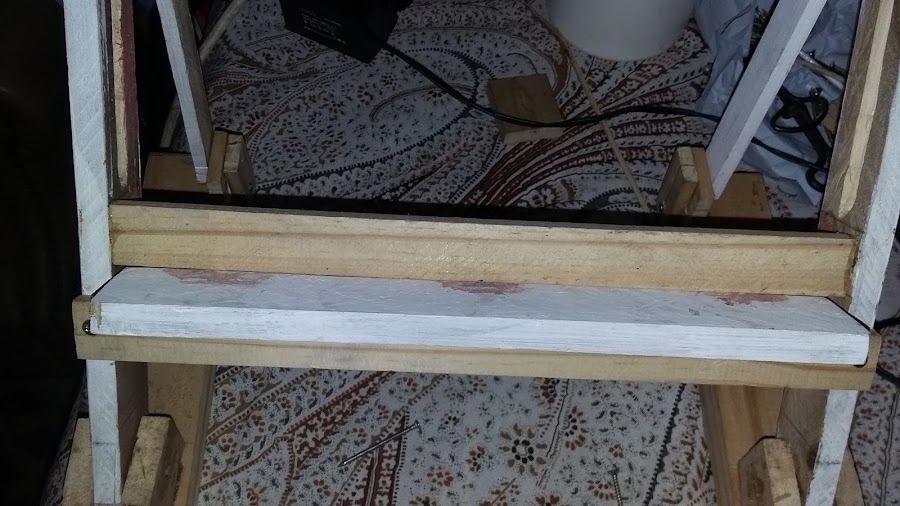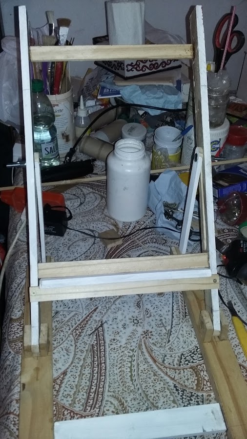 Averigüé para comprar unos apliques de metal para que se pueda mover e inclinar la parte donde se apoya el cuadro, eran carísimos, así que eso lo hice con unos trocitos de madera y más palillos de brochetas, jijiji. En la foto de aquí debajo pueden ver el detalle de lo que les digo