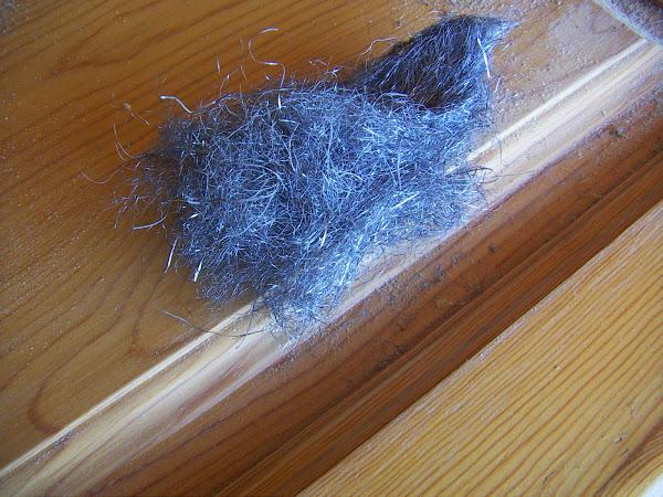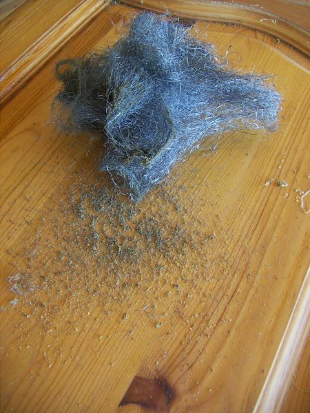 De vez en cuando sacudimos la lana abriéndola con las dos manos para eliminar los restos de decapante que se quedan acumulados y repetimos el proceso.