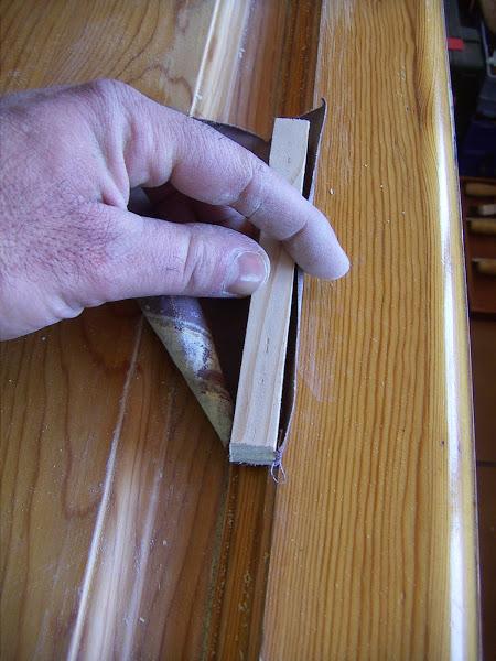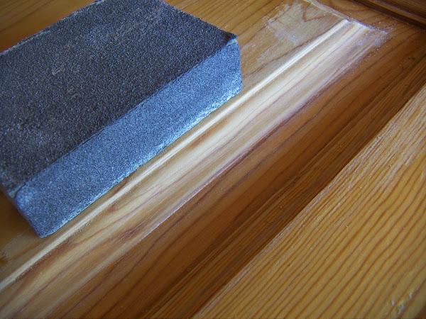Después de decapar y limpiar bien la superficie de la madera con alcohol o acetona, lijaremos suavemente toda la madera.