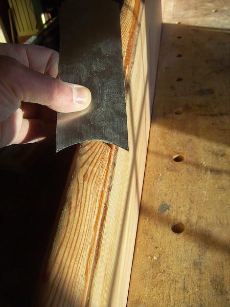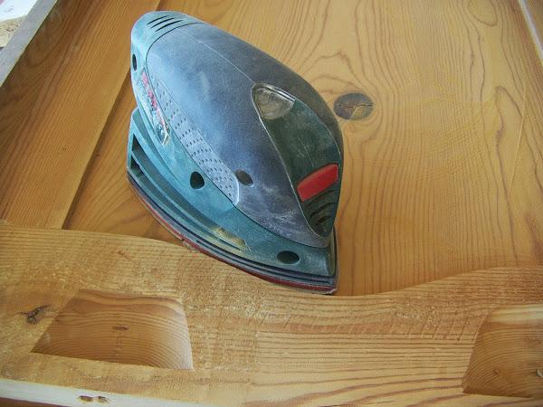 Podríamos lijarla primero con una lija de grano grueso ( entre 40 y 80 ) y luego con una de grano ya más fino ( 100, 150, 200 ) pero lo que haré primero, será pasarle una cuchilla de ebanista a toda la superficie y ya después le pasaré la lija