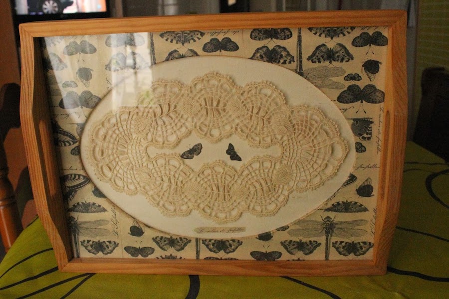 Hola Quiero enseñaros esta bandeja que he decorado con mis sellos de la marca IOD . Se trata del mismo sello que utilice en los cojines y que podéis ver en la entrada anterior Se trata de una bandeja de madera muy fina.. casi parece cartón , que compre en color madera natural . Para darle algo de vida al exterior he puesto un papel de rayas y flores muy vintage seguido de pasta craqueladora Como d ...
