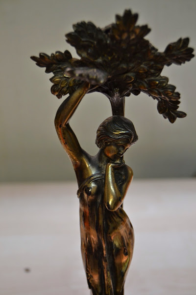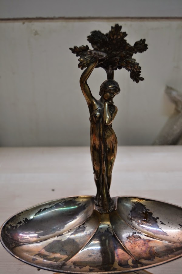 Poco a poco, sacamos todo el barniz con una lana de acero muy fina, de cada recoveco de la figura; cara, cabello, dedos de las manos, pliegues del vestido, de toda la bandeja y pie de ella, de las hojas...