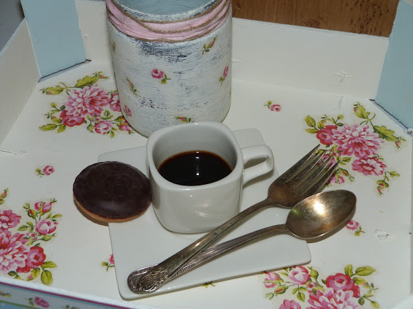 Y ya preparada la bandeja, comienzo con los accesorios necesarios para presentar el desayuno. En primer lugar, he pintado un frasco con acrílica chocolate y a continuación con la misma chalk paint blanco antiguo, aplicada de forma irregular y muy tosca, dejando las marcas de la brocha.