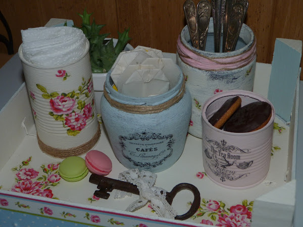 Una lata en blanco antiguo, con decoupage de distintos motivos de la servilleta, grupos de rosas y rositas sueltas, y cuerda en la parte inferior.