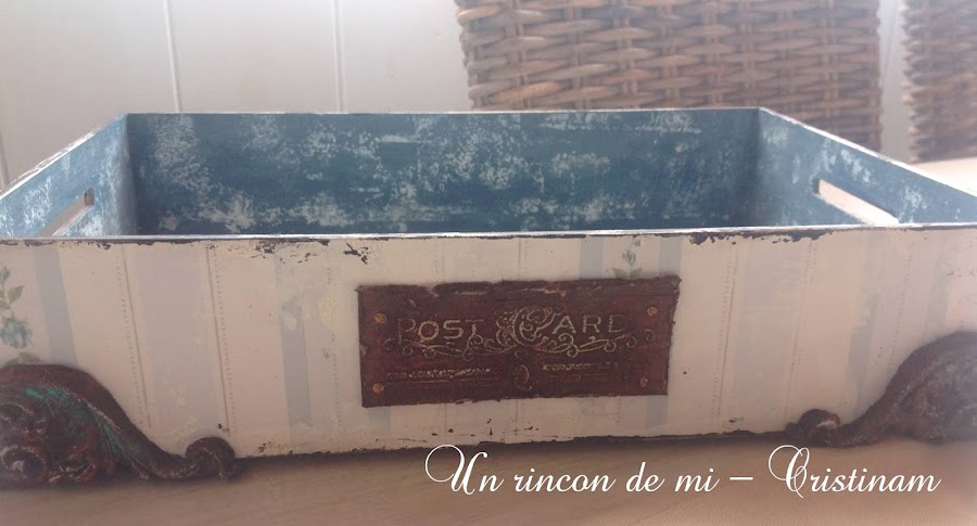 Para darle algo de vida al exterior he puesto un papel de rayas y flores muy vintage seguido de pasta craqueladora