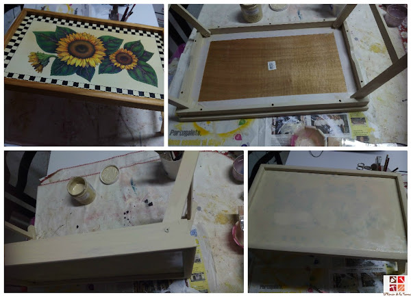 Por último dos manos de barniz al agua por toda la bandeja y después pasé con un trapo y un poco de cera color nogal envejeciendo algunas zonas, en este orden, primero barniz y después cera.