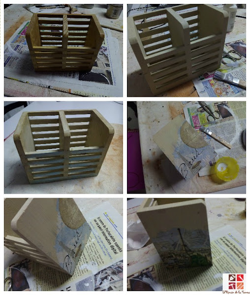 Para que mi cuñada tuviera un pequeño detalle a juego de su bandeja, compré un porta cubiertos que pinté con la misma pintura tono eterno de americana decor, pinté también con acrílica azul , usé unos trozos de la servilleta en los laterales y dos manos de barniz y un poco de cera color nogal por algunas zonas.