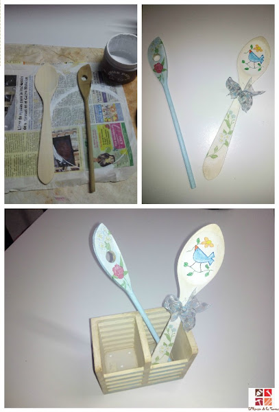 También la compré dos cubiertos de madera que pinté uno en azul y usando decoupage de unas flores y la cuchara blanca pinté a mano un pajarito, decoupage en el mango y una mano de barniz para las dos y cera oscura por algunas zonas.