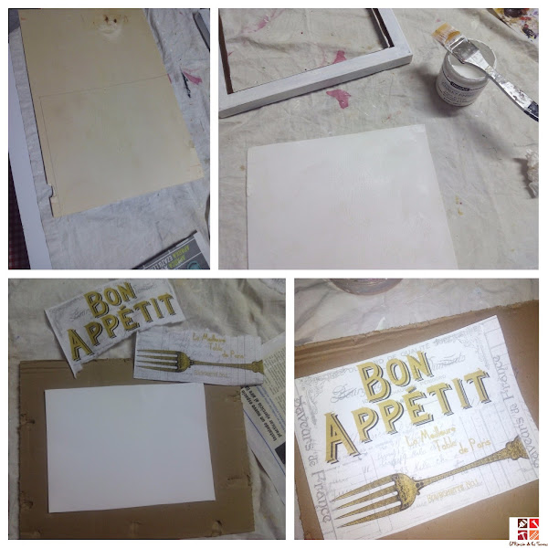 Después he cortado a medida del marco un tablero DM, lo he pintado de blanco para que al poner la servilleta con el fondo de este tono resalte más.