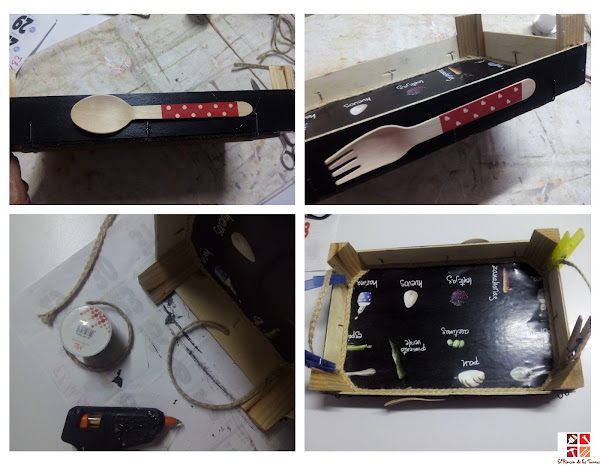 Por último y para decorar, pegué con silicona caliente unos cubiertos decorativos y a modo de asa la misma cinta de cuerda trenzada