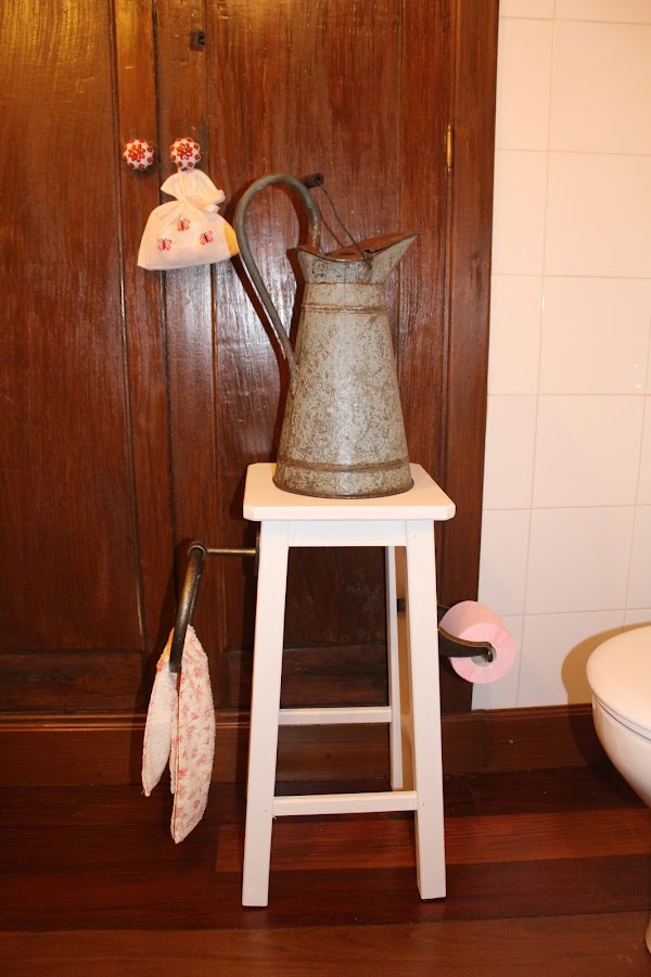 La jarra que adorna la banqueta que utilizamos para el rollo de papel higiénico y la toalla del bidé, es una de nuestras últimas compras en el mercadillo dominguero de nuestra ciudad. Nos llamó especialmente la atención porque tiene tapadera.