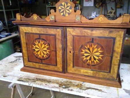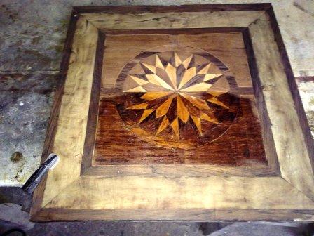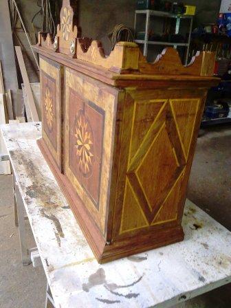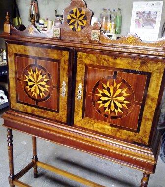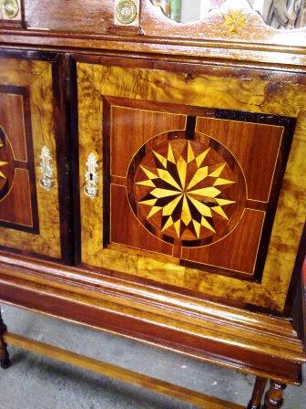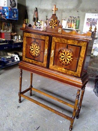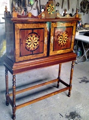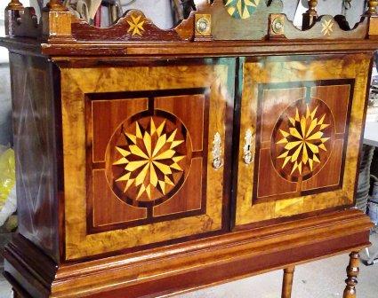 En primer lugar ha habido que quitar minuciosamente capa por capa el barniz que impedía apreciar las distintas maderas con las que originalmente se realizó la marquetería (hemos contado hasta 6 tipos distintos). Una vez que la madera estaba lijada, se procedió a reponer aquellas piezas de marquetería que estaban ausentes así como los terminales del copete. A continuación se tiñe la pieza, y por último se aplica laca para proteger y dar brillo. Y el resultado final lo podeis juzgar vosotros mismo en las siguientes imagenes.