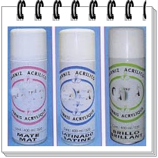 - Barniz acrílico: este barniz se diluye fácilmente con agua y su gran ventaja es que seca muy rápido. Son menos fuertes o duros que los anteriores, pero al aplicar varias capas aumentamos la dureza del mismo. Son mas ecológicos y son que mas empleamos en manualidades puesto que se pueden emplear en cualquier tipo de pinturas.