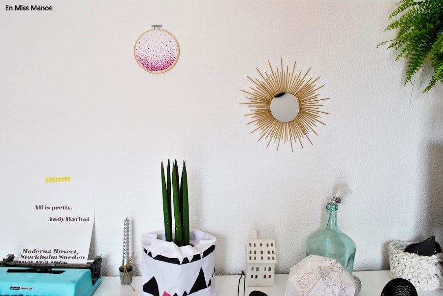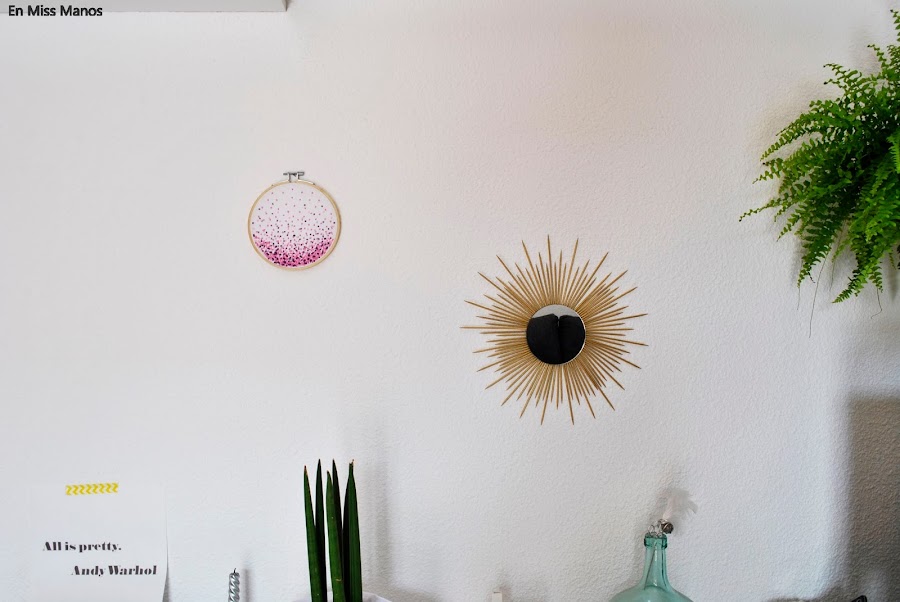Me habría gustado hacer un par en dos colores distintos porque la idea me ha gustado como ha quedado, pero ya veré que hago con el otro bastidor que tengo. De momento me gusta como queda en mi rincón favorito del salón, al lado de ese espejo sol que hice el año pasado!