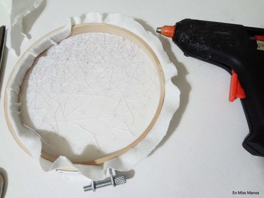 Se corta bien la tela sobrante dejando 1cm más o menos para poder doblar e ir pegándola por dentro con silicona caliente.