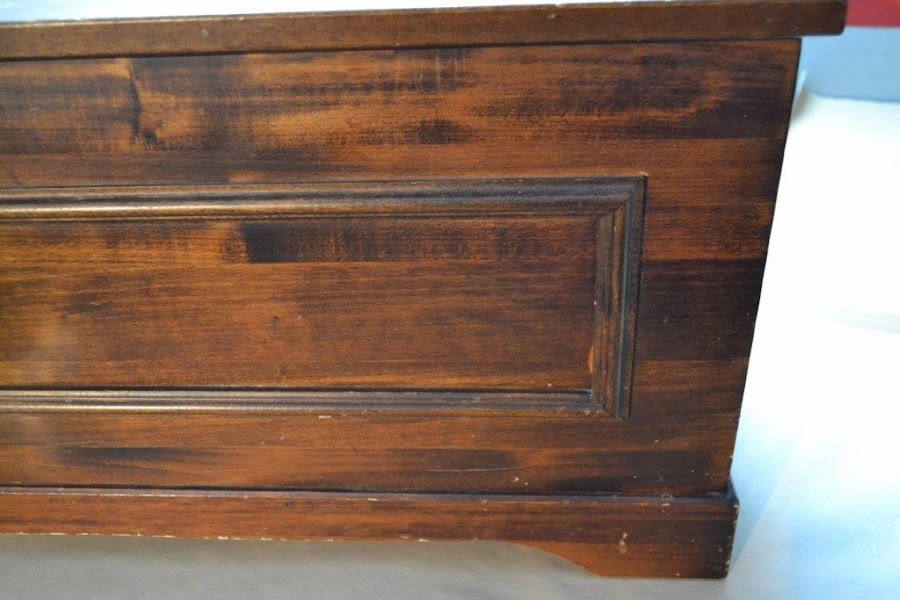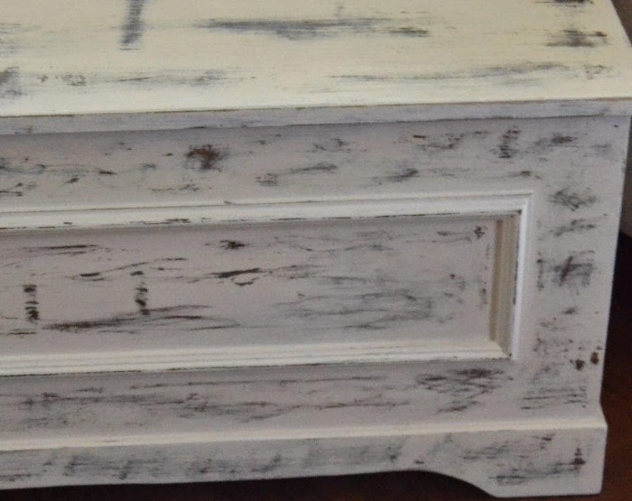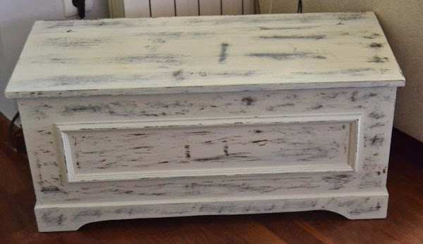 Una vez decapado, se le ha aplicado pintura color carrara y desgastado para que saliera el color de la madera original. Dos capas de pintura y lijado entre ellas. Terminado con barniz incoloro satinado.