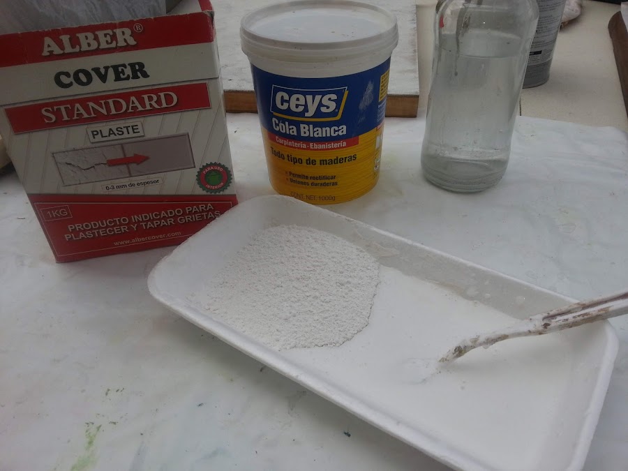 Para la pasta de los stencil utilizo lo que se ve en esta foto, el tema de añadir bastante cantidad de cola de carpintero hace que los relieves creados tengan una tremenda dureza y se adhieran perfectamente a la madera.