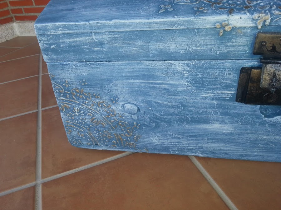 En las esquinas puse estos stencil pequeños caseros como ya os enseñe y en la tapa de baúl también es un stencil casero pero ampliado.