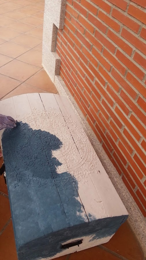 Para los stencil en relieve doy esta patina de cera con el dedo, y crea unos reflejos increíbles, de verdad que las fotos no hacen justicia de lo bonito que quedó el baúl.