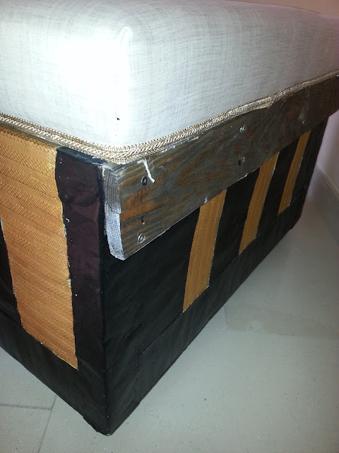 La tapa se le pone fijada con cola de contacto una espuma de 10 cm de grueso y se le pone grapada una tela que se remata para que no se vea la grapa con la pasamanería que se aprecia en esta foto.