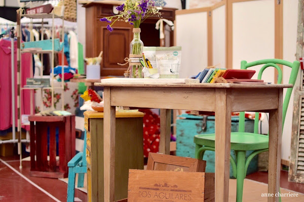 Monté un puesto con todas las piezas recicladas que tenía en casa y parte de mi decoración. Añadí unas telas provenzales que me dio mi madre y llené el puesto de color; la verdad es que fue divertido montarlo, decorarlo, etc.