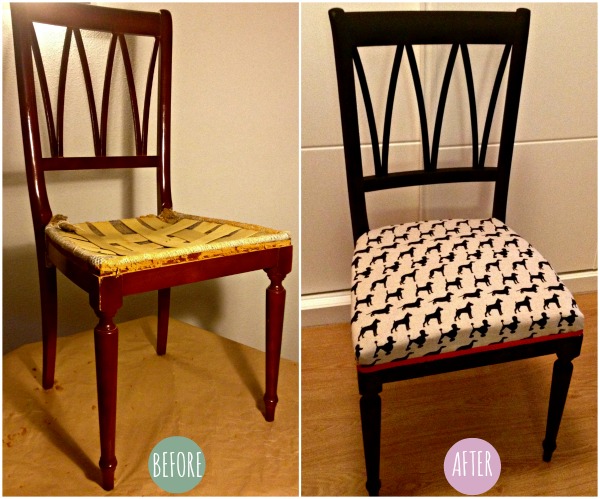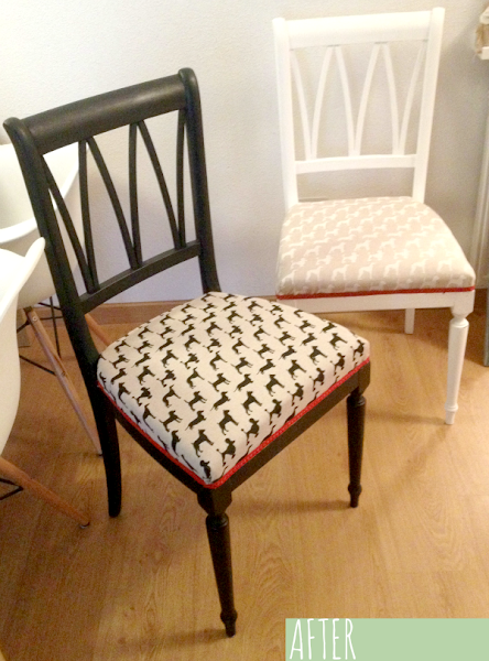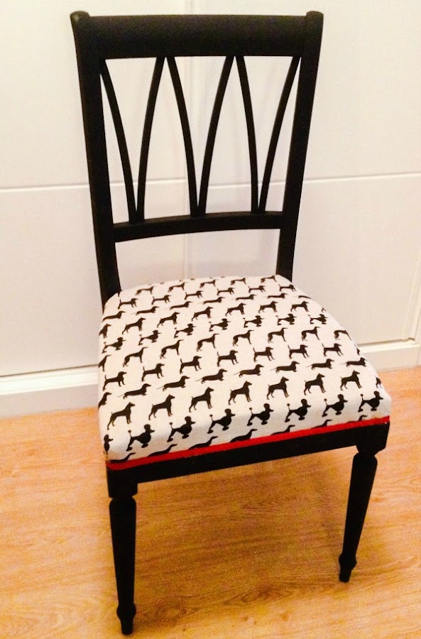 Ya conocéis como soy y lo que me gusta la recuperación de muebles así que me dispuse a cambiarlas radicalmente. Al ser una pareja me decidí por combinarlas, como si del yin y en yang se tratasen. Una blanca y otra negra, tapizados nuevos con unas telas de perritos que me enamoraron y para terminar un toque coral para ambas.
