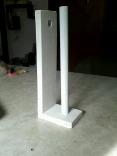 Como puede verse, algo fácil de hacer. Una madera de palet de 10cm como base, otra de 20cm formando una L y un palo redondo de cortina de unos 20cm aprox.