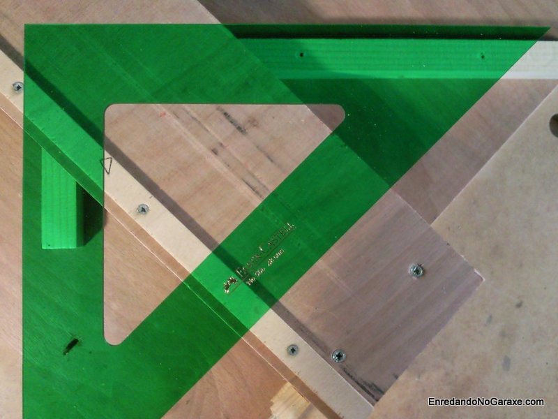 Lo segundo es hacer los cortes lo más perfectos a 45º que podamos. Una opción es usar una ingletadora, que tendremos que tener con sus ángulos de corte muy bien ajustados. Otra opción es hacerse una guía o plantilla para cortes a inglete con la sierra circular, que es precisamente el tema de esta entrada. Para fabricarla lo primero que necesitamos hacer es una guía para cortes a 90º (que podéis ver aquí como fabricarla), la cual modificaremos para cortar a 45º. Son importantes dos cosas en esa plantilla para cortes a 90º: que el corte vertical sea lo más cercano posible a 90º y que el corte que realiza a través de los listones también sea lo más cercano posible a 90º. Ahora la modificaremos como vemos en el vídeo, para lo que es muy importante disponer de una escuadra lo más perfecta posible. Lo más de confianza y más barato que encontré fue una de esas escuadras verdes de delineante de Faber-Castell. Me vendrá bien en el taller ya que es más precisa que mi escuadra de carpintero y que la otra escuadra de plástico transparente que tengo.