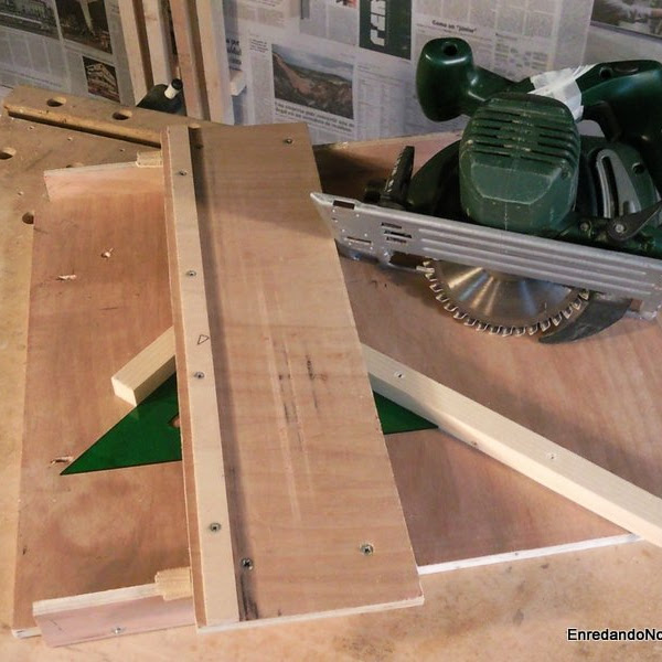 Y me queda decir por qué no puse solo un listón en la plantilla para cortar a 45º. Realmente podríamos cortar un lado, girar el listón (la cara que estaba hacia arriba colocarla ahora hacia abajo) y ahora poner el otro lado en la zona de corte. El problema es que a veces cortaremos alguna moldura y esta solo tendrá una cara lisa para apoyar en el tablero de la base, de manera que no es posible girarla y apoyar la zona de la moldura contra el tablero. Por eso creo que es mejor tener la posibilidad de realizar los dos cortes con la misma cara del listón apoyada en el tablero de la base y para eso necesitamos los dos listones.