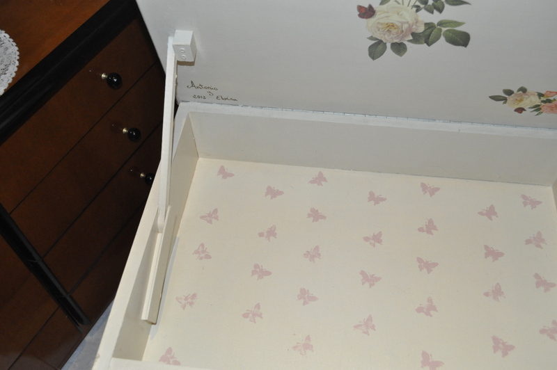 Esta es la tapa ya una vez acabado el costurero,ya decorado.Aqui podeis ver el artilugio que me maquiné para que pudiera abrirse la tapa y que se pudiera mantener abierta.Todo hecho con madera.
