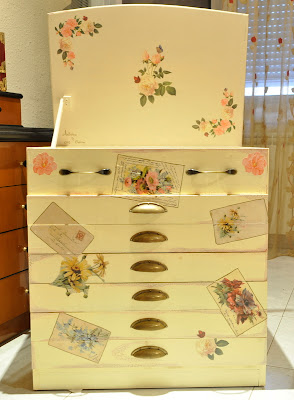 Y aqui lo podeis ver ya acabado el trabajo,despues de haberlo decorado mi mujer.Con decoupage y estarcido.Y al pintarlo tambien se usó la técnica del craquelado.