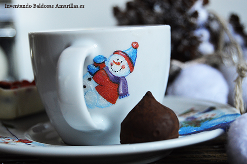 Lo bueno de las servilletas es que podemos ir cortando pequeños dibujos y con ellos crear nuestros propios diseños alrededor de la taza y el plato.