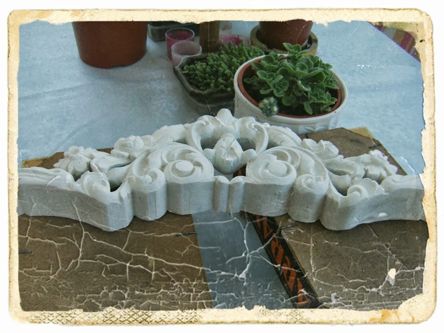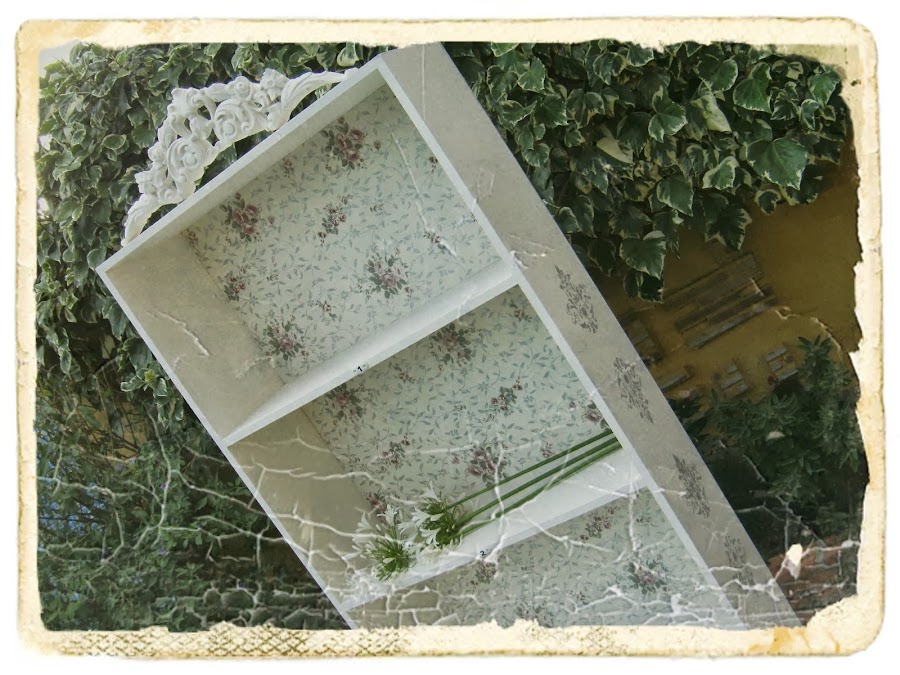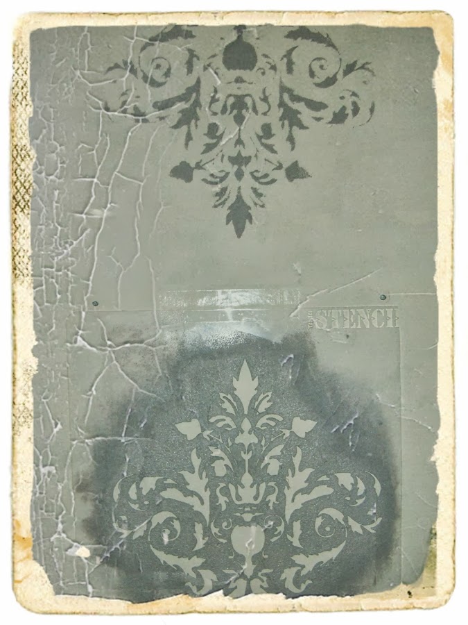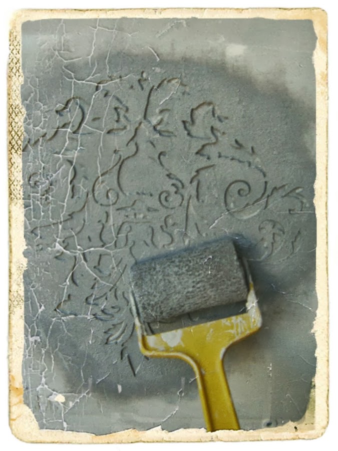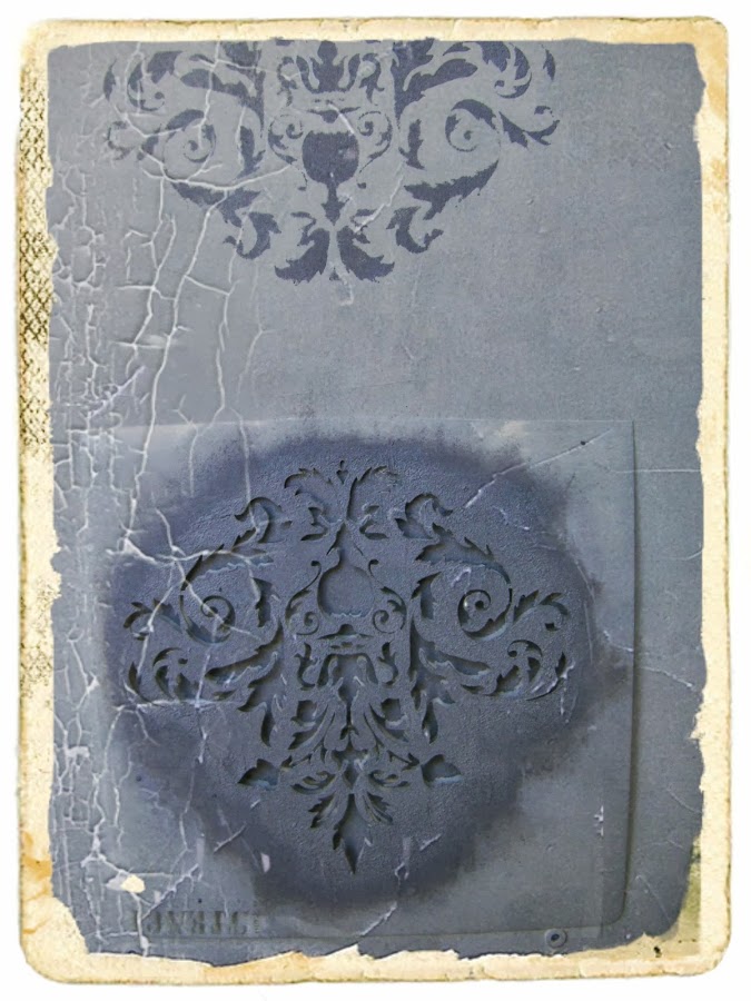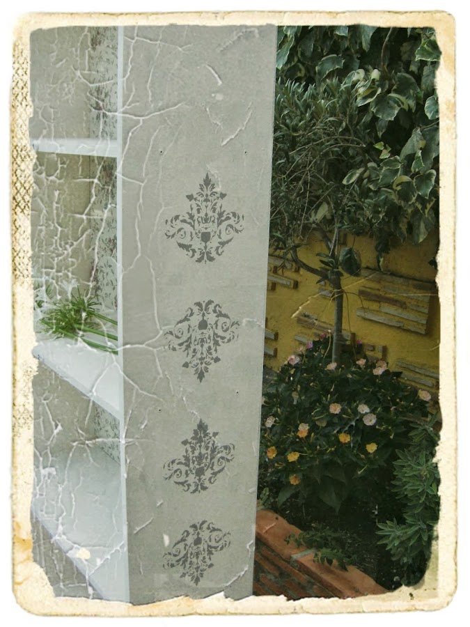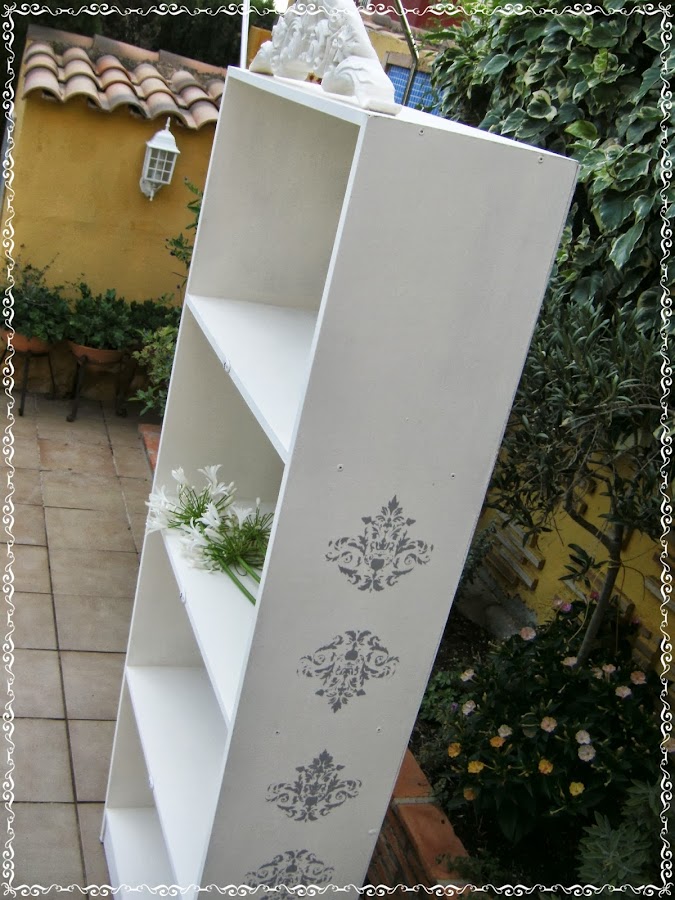 Bueno, por ultimo pintamos el exterior igualmente que el interior de la estantería, fijamos bien la cornucopia y procedemos a hacer lo que mas me gusta y con lo que mas disfruto...el estarcido. Elegimos la plantilla que mas nos guste y a disfrutar. En este caso yo he elegido esta plantilla tan preciosa y el color Paloma de la Chalk Paint mezclado con la acrilica color plata de Aqualux de Titan.
