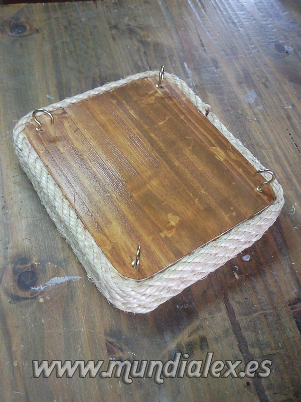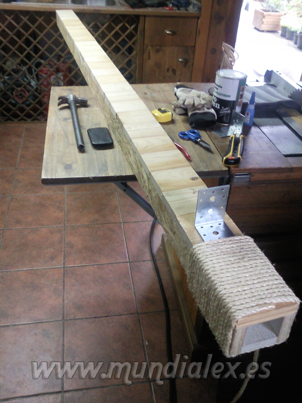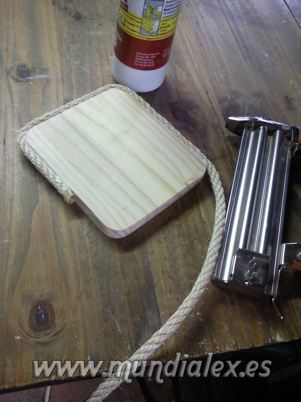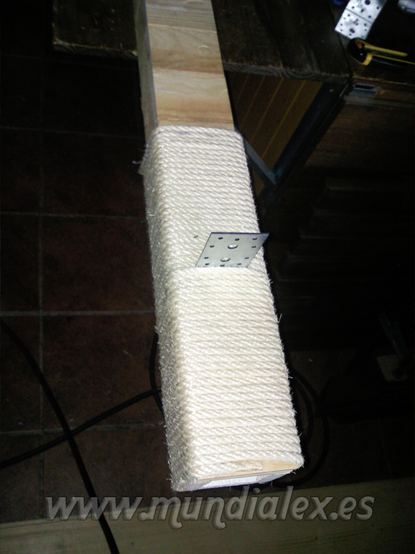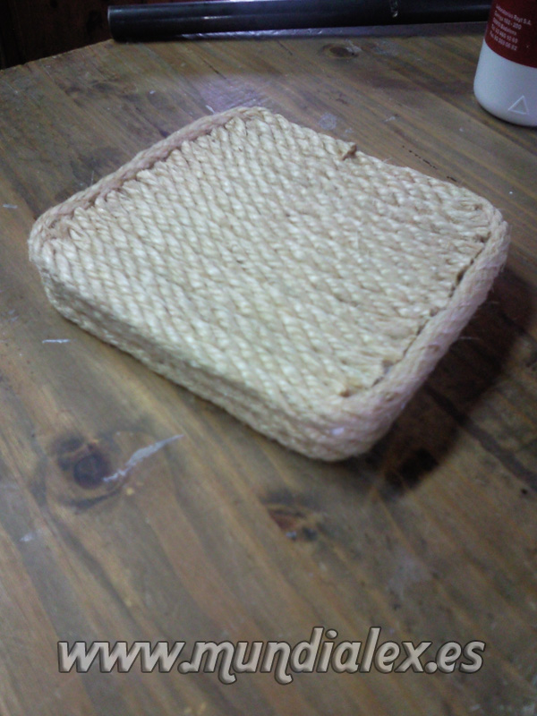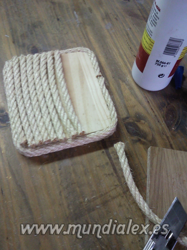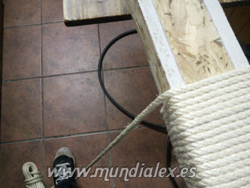 La parte de arriba la rematé con una pequeña plataforma hecha con una tabla y cubierta también de cuerda cortando cachos y pegándolos con cola blanca.